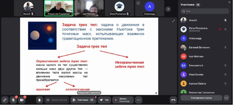 12 декабря в Уральском математическом центре состоялся онлайн-семинар, на котором д.ф.-м.н. В. В. Сидоренко (Институт прикладной математики им. М. В. Келдыша РАН, МФТИ) представил доклад по теме — «Интегрируемые модели вековой эволюции движения в задаче трёх тел».